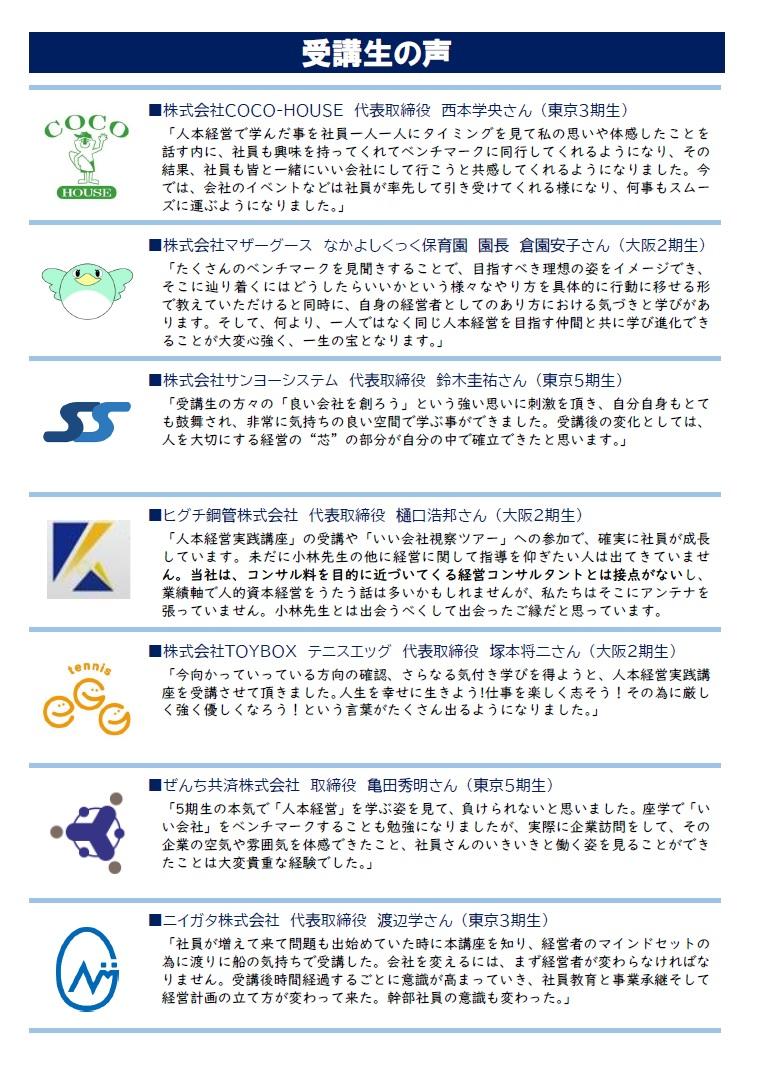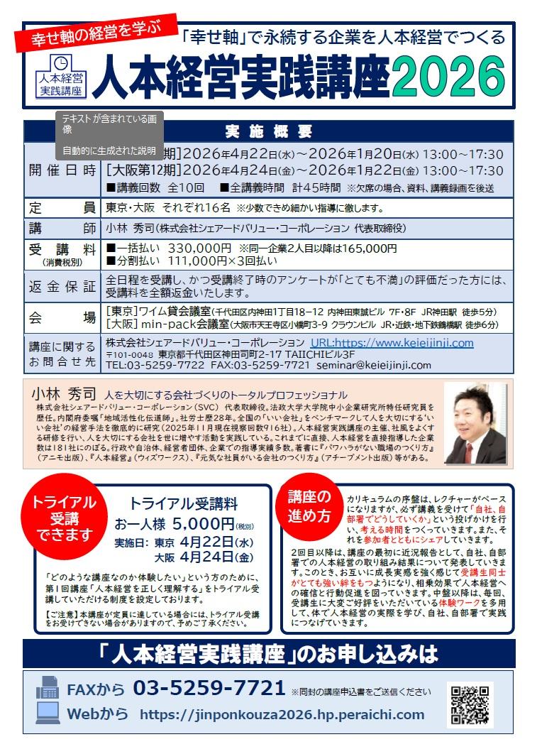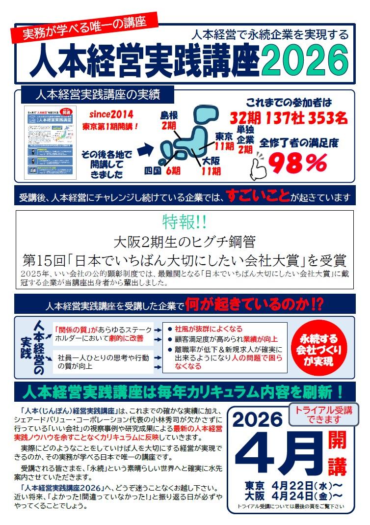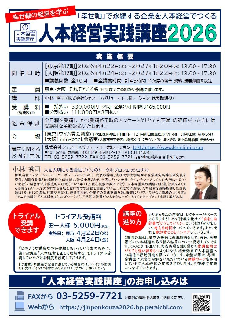 もうどう考えても勝負は決したといえるでしょう。とことん幸せ軸の経営を突き詰めていく企業が社会の主役になっていくのです。それなりの時間がかかることゆえ業績軸から幸せ軸へ、この経営の舵取りを一刻も早く経営者は決断し断行していただきたいのです。弊社では人本経営実践講座で確実にその支援をすることができます。